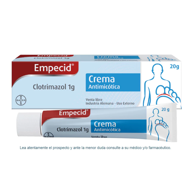 Empecid Crema de Bayer con Clotrimazol 1g es un antimicótico efectivo contra todos los hongos de la piel, que ataca la infección y alivia los síntomas. El clotrimazol es un antifúngico cuya acción consiste en detener el crecimiento de los hongos que ocasionan la infección. Debe ser aplicado 2 veces al día.