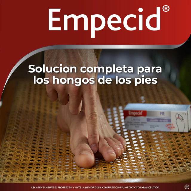 Empecid Pie Crema de Bayer es un antimicótico que alivia los síntomas del pie de atleta desde la primera aplicación, gracias a su fórmula con Lidocaína, Bifonazol y Mentol. Además es efectivo para eliminar la micosis de raíz. Se aplica 1 vez al día.